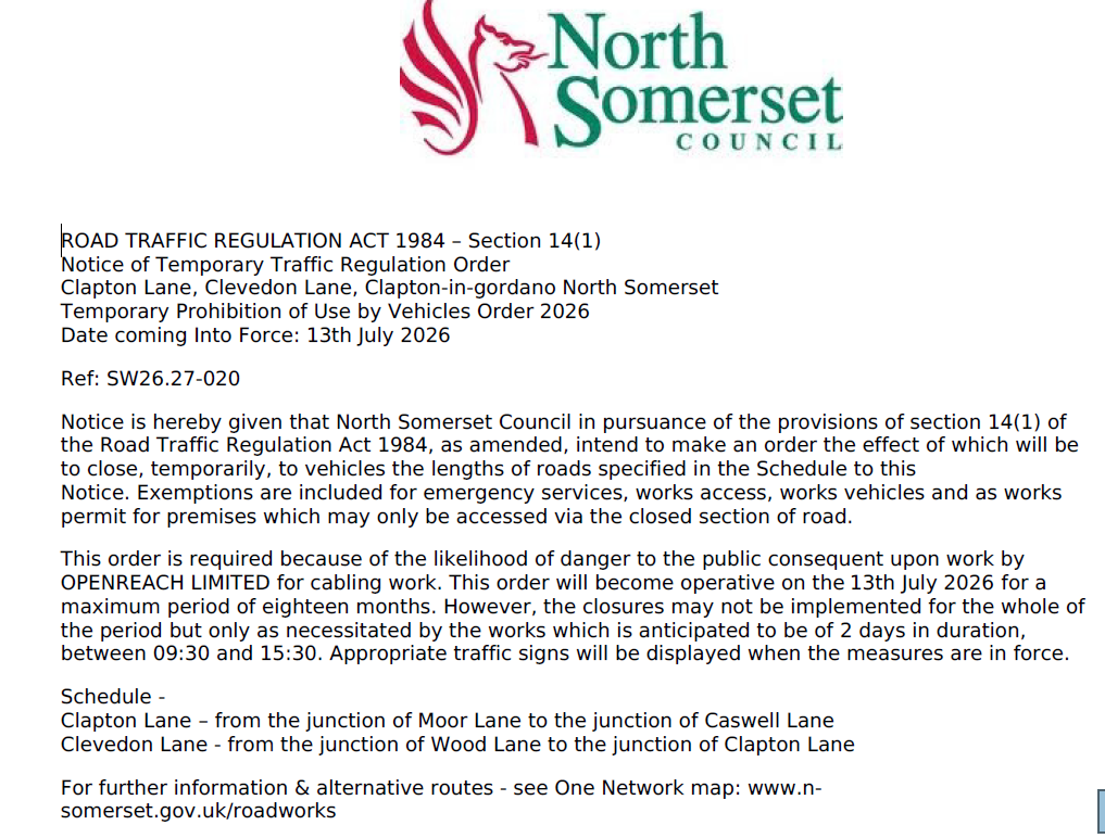 Please see attached notice regarding the road cloure Clapton Lane, coming into force on the 8th April 2026.